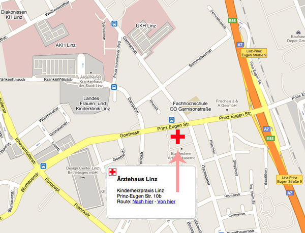Vom Designcenter kommend fahren Sie am einfachsten schon vor dem Ärztehaus rechts zu den Patientenparkplätzen. Sie haben aber auch die Möglichkeit, von der Garnisonstraße aus hinter das Ärztehaus zu den Patientenparkplätzen zuzufahren.